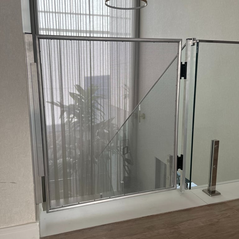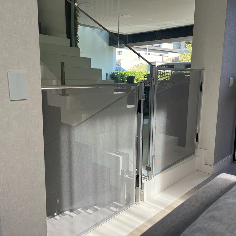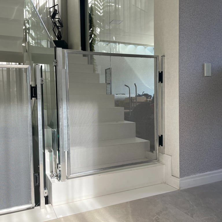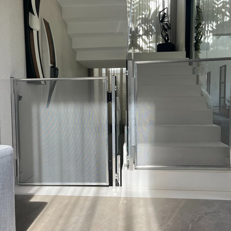 O portão de escada Cercare foi desenvolvido especialmente para prevenir acidentes em áreas com desnível, como escadas internas e externas, oferecendo segurança extra para crianças pequenas e pets, sem comprometer o visual do ambiente.